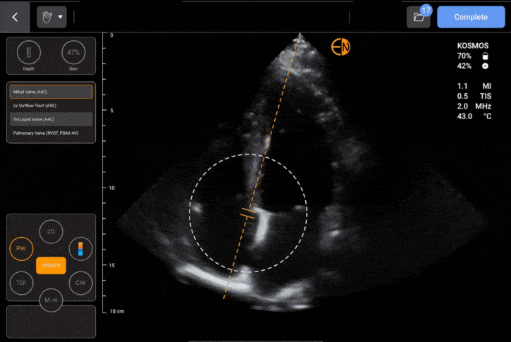 Pozicionimi automatike i volumit të kampionit në Doppler PW mbi LVOT, MV, PV, TV. Pozicionimi automatike i volumit të kampionit në TDI mbi unazën septale dhe laterale të MV dhe mbi unazën e TV. Rregullimi automatik i linjës bazë për optimizimin e sinjalit.